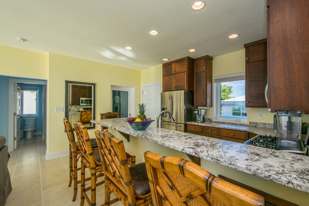 Each Villa has two master suites with king beds separated by a great room.The gourmet kitchen has granite countertops and the living room features a wall of pocketing sliding glass doors that open on to your private veranda. Each room of the Villas has their own separate climate control. For your convenience a washer and dryer is located in each villa. The patio provides a common lounge area where you can relax and also enjoy your own barbecue. Four bicycles are provided to each Villa so you can explore the island at your own leisure.