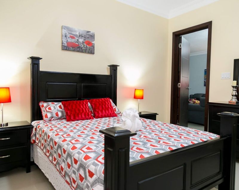 Located in the centre of New Kingston, this first floor spacious two-bedroom apartment located in a new complex can meet all of your vacation stay needs. It’s 2BR, 2.5BTH luxury apartment located directly across the street from the newly constructed AC Marriott hotel (now with a Starbucks Coffee) and business centre. Our apartment is just a 30 minutes’ drive from Norman Manley Airport and resides in the just newly completed Hamptons at Fairway complex right in the centre of New Kingston. It’s a 4 minutes’ drive from the Bob Marley Museum and close to a wide array of restaurants, bars, attractions and night life activities. You’ll have a pool and two luxurious bed rooms, both with their own full bathroom, TV and AC. You also have a living room w/ (AC recently installed),TV, adjoining an open concept full kitchen and washer & dryer. During your stay you’ll have access to free parking, (elevator which goes from garage to each floor), free internet, cable TV, and an excellent view of Kingston.