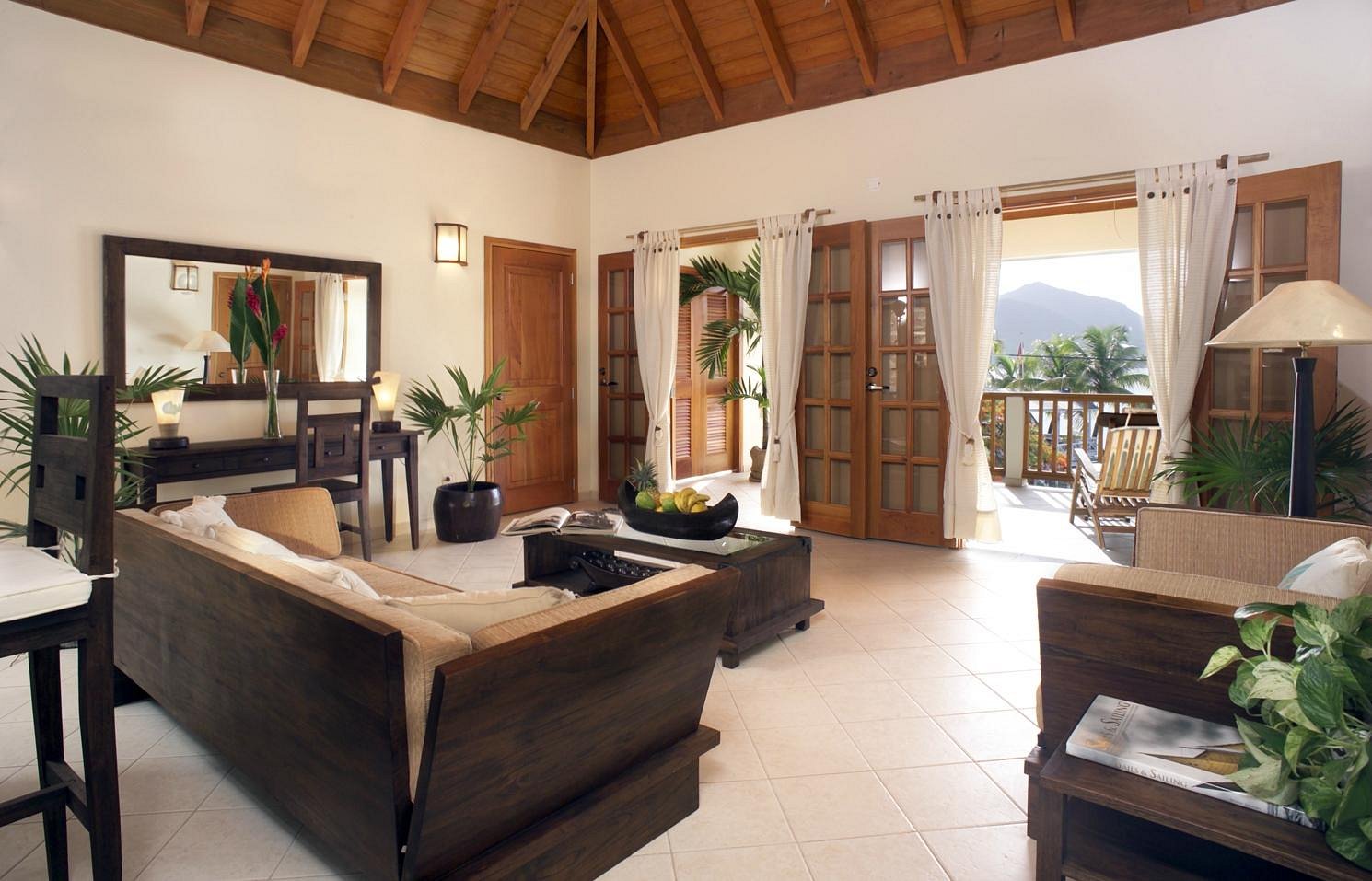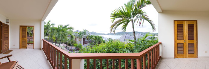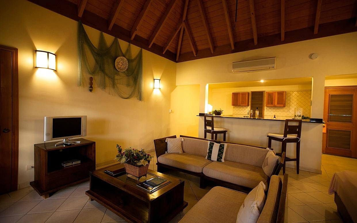 One Bedroom Executive Suites: They feature a very roomy bedroom/bath suite and a very large living room/kitchen. It is a split-level unit with the bedroom/bathroom suite located on the bottom floor and the living area on the top floor. This type of accommodation boasts of 2 separate balconies, one on either level, thus giving commanding views of both the tropical landscaped gardens and the most spectacular Falmouth Harbour.